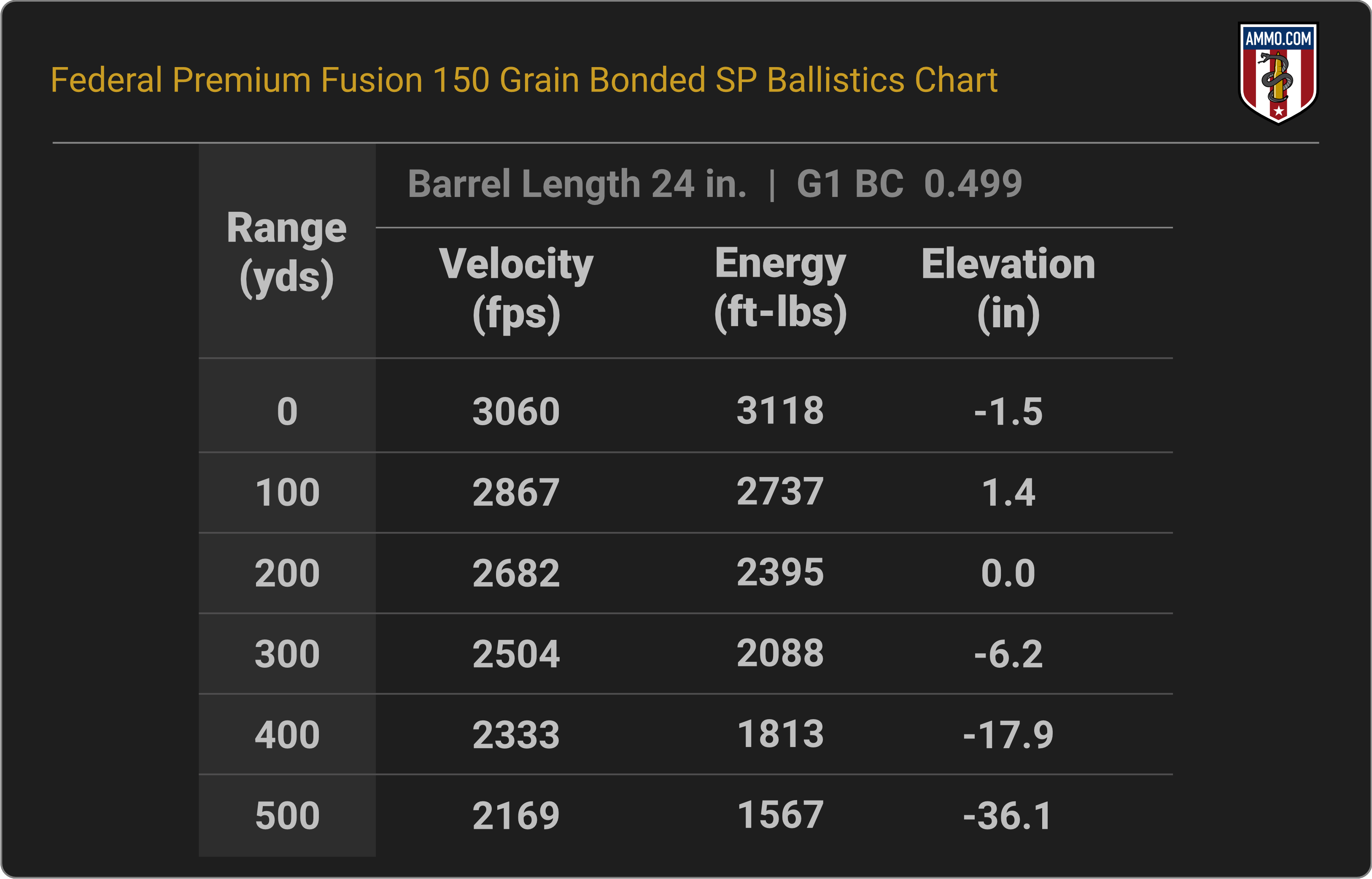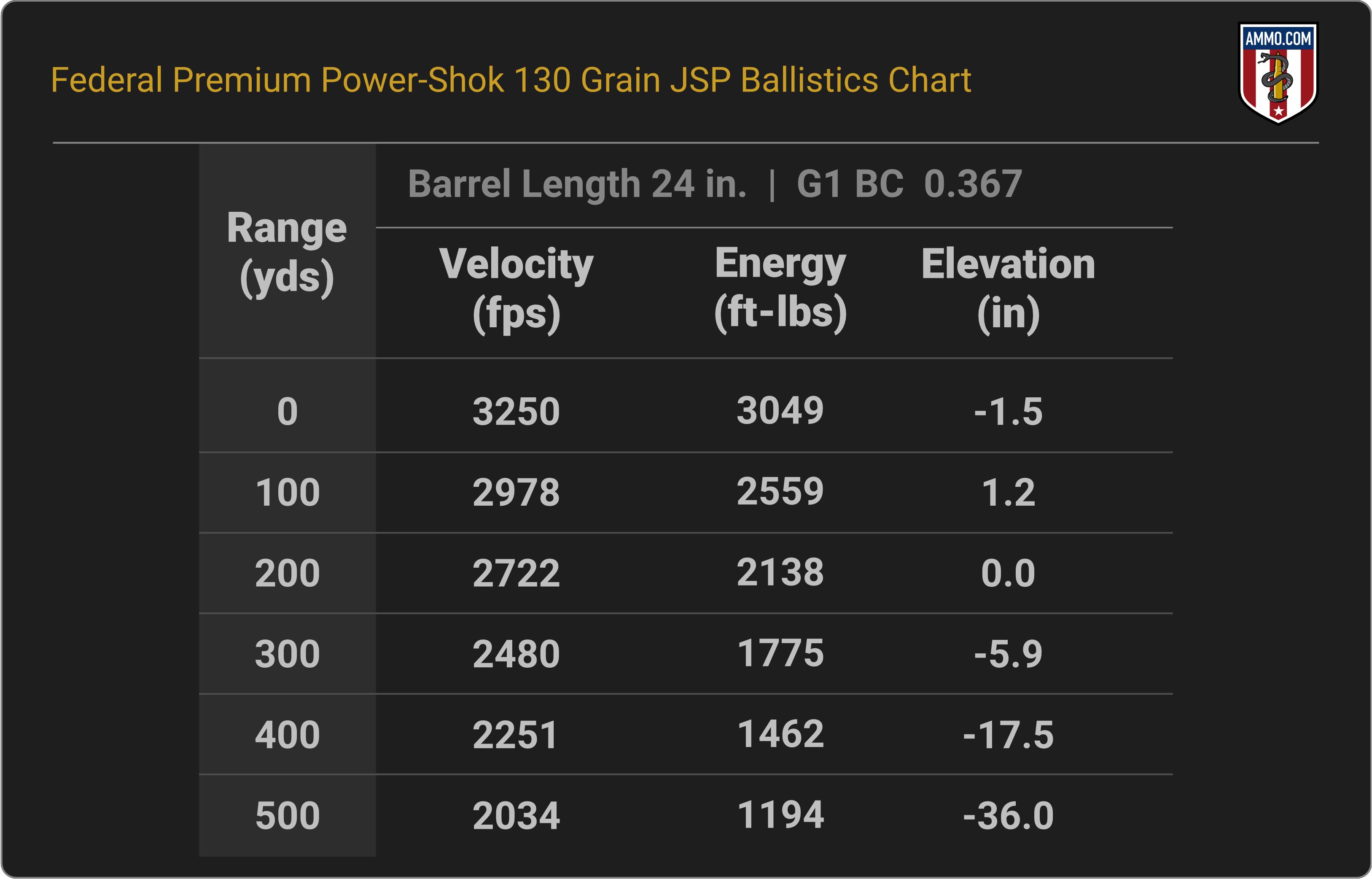 Jump to a ballistics chart: Power-Shok 130 Grain JSP | 130 Grain Trophy Copper | 136 Grain Terminal Ascent | 140 Grain Hybrid Hunter | Fusion 150 Grain Bonded SP