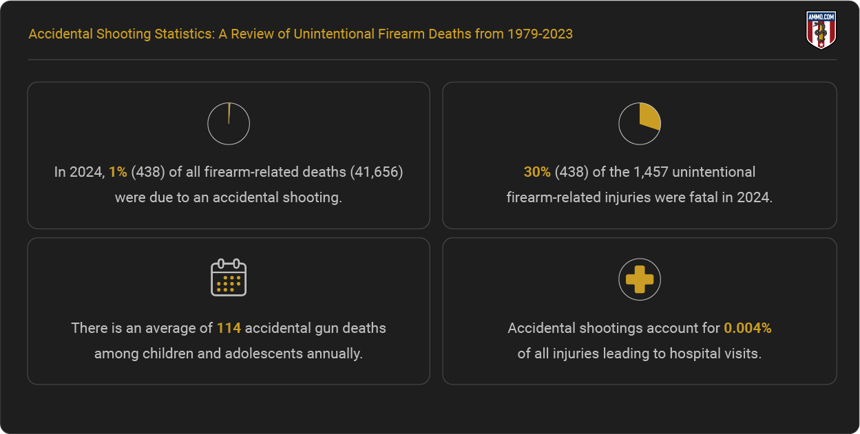 - In 2024, 1% (438) of all firearm-related deaths (41,656) were due to an accidental shooting.