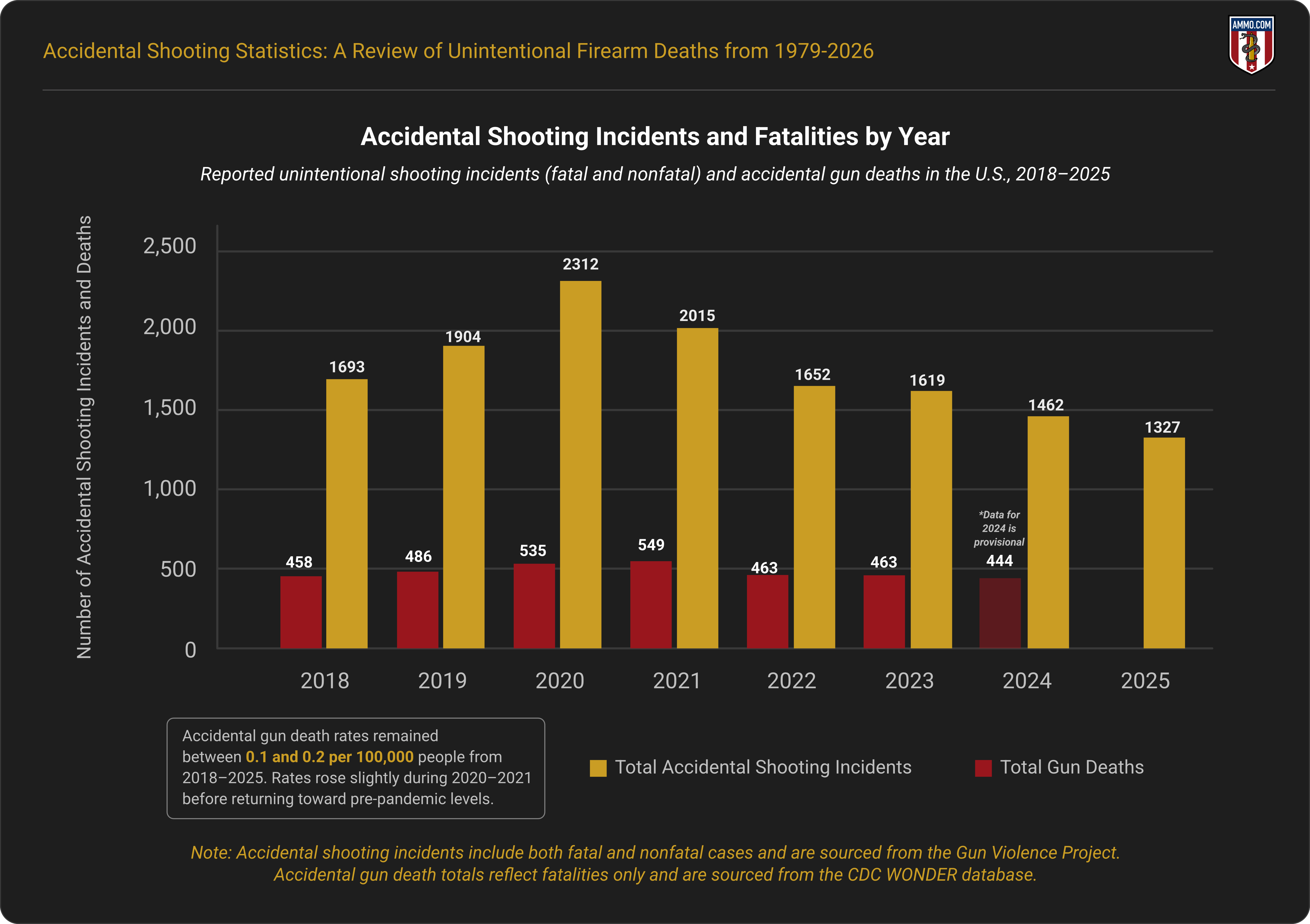 On average, there were 485 accidental shooting deaths each year between 2018 and 2024. This average was driven up by the 535 deaths in 2020 and 549 deaths in 2021. Accidental shooting deaths decreased to 444 in 2024, which aligns with pre-COVID trends.