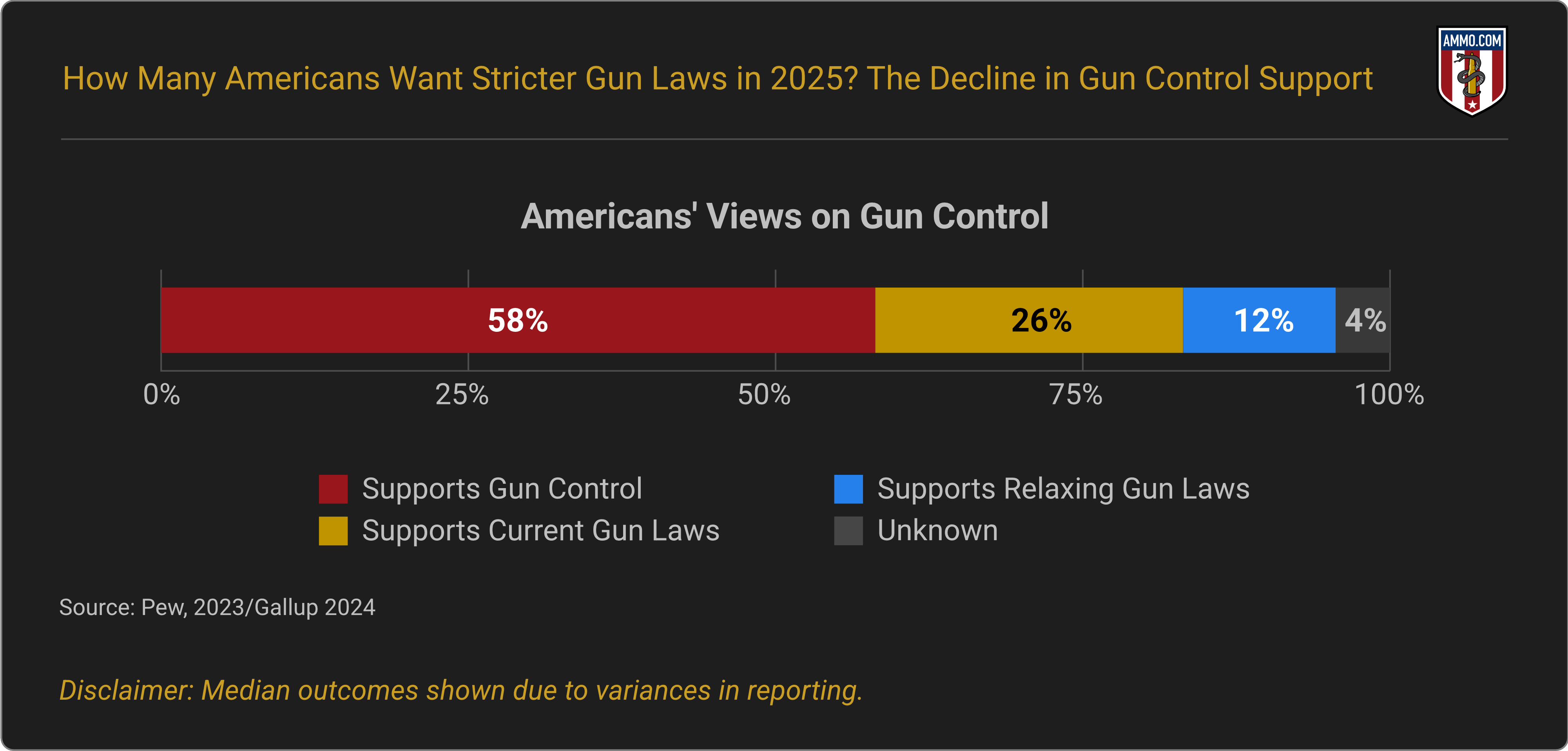 Recent surveys suggest that 56% to 61% of Americans support gun control. (Pew, 2023/Gallup 2024)