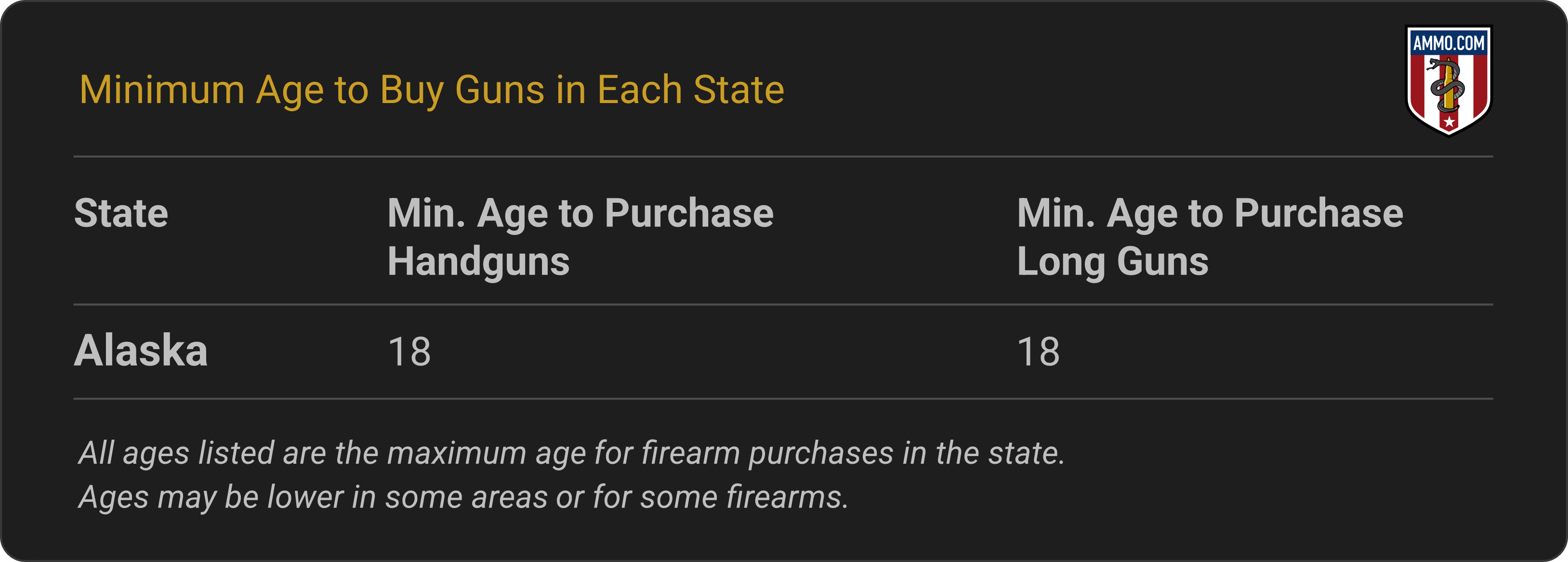 Alaska doesn’t have any special restrictions on firearms purchases by age. It is legal for 16-year-olds to possess firearms with parental consent, but it is unlawful for anyone under 18 to purchase a long gun from an FFL or under 21 to purchase a handgun, per federal law.