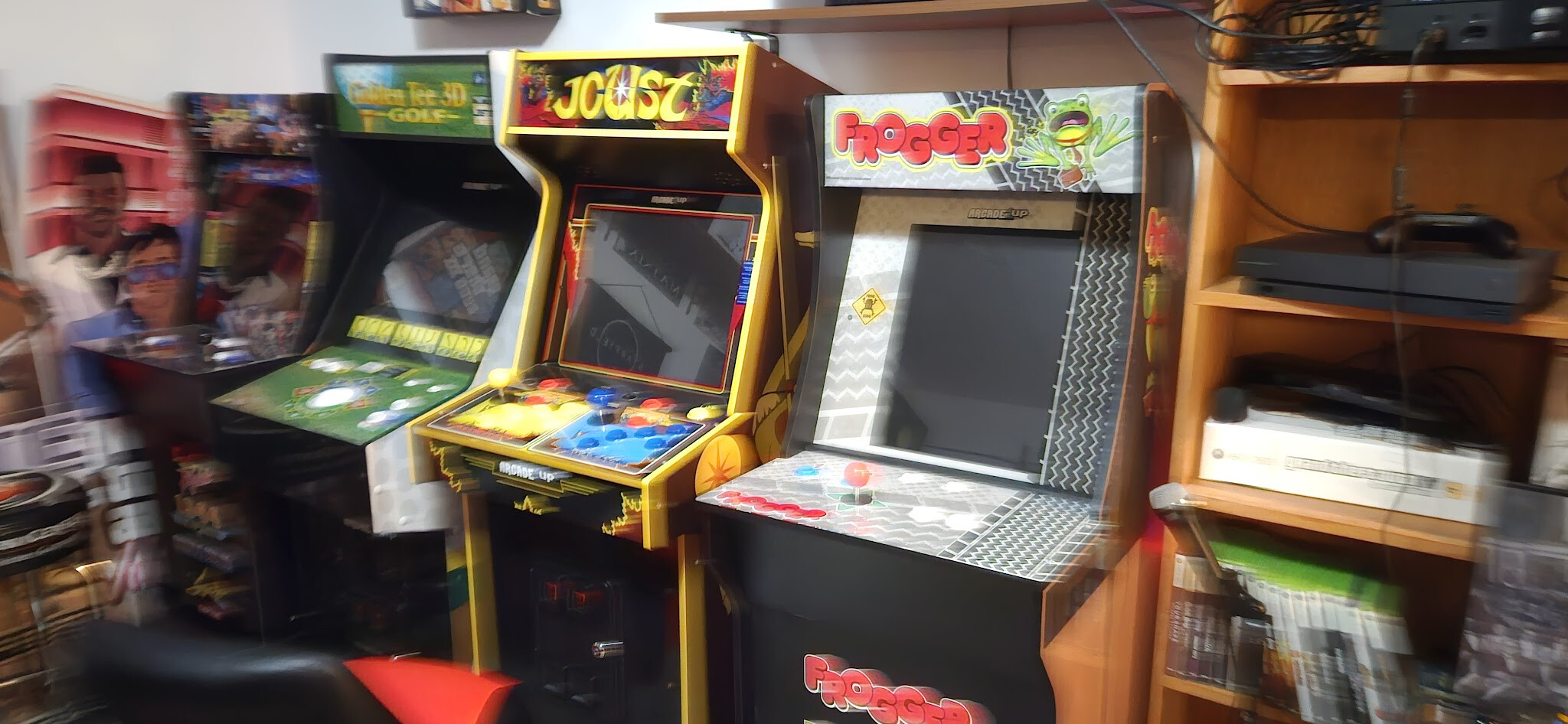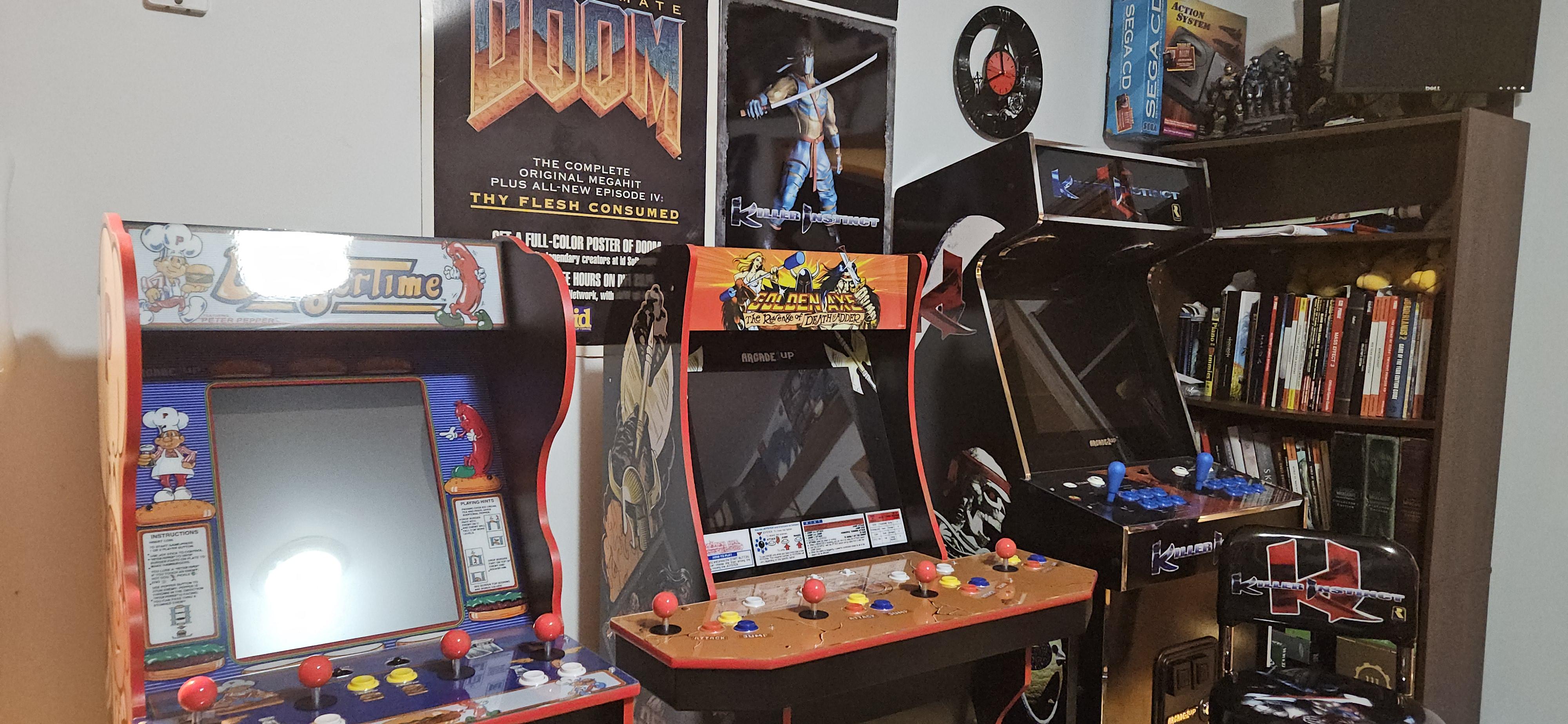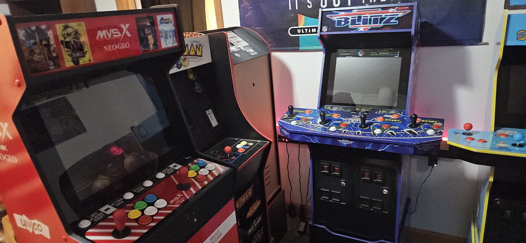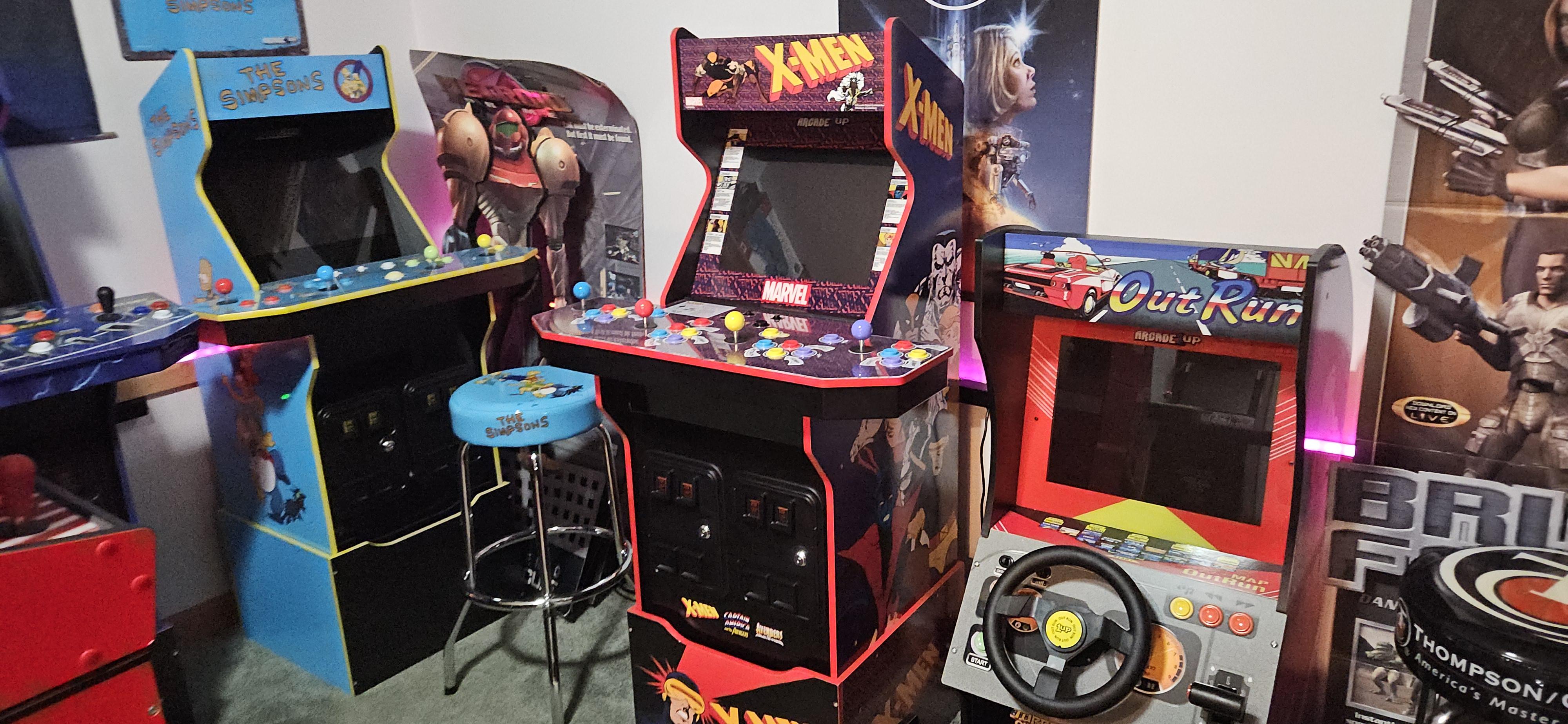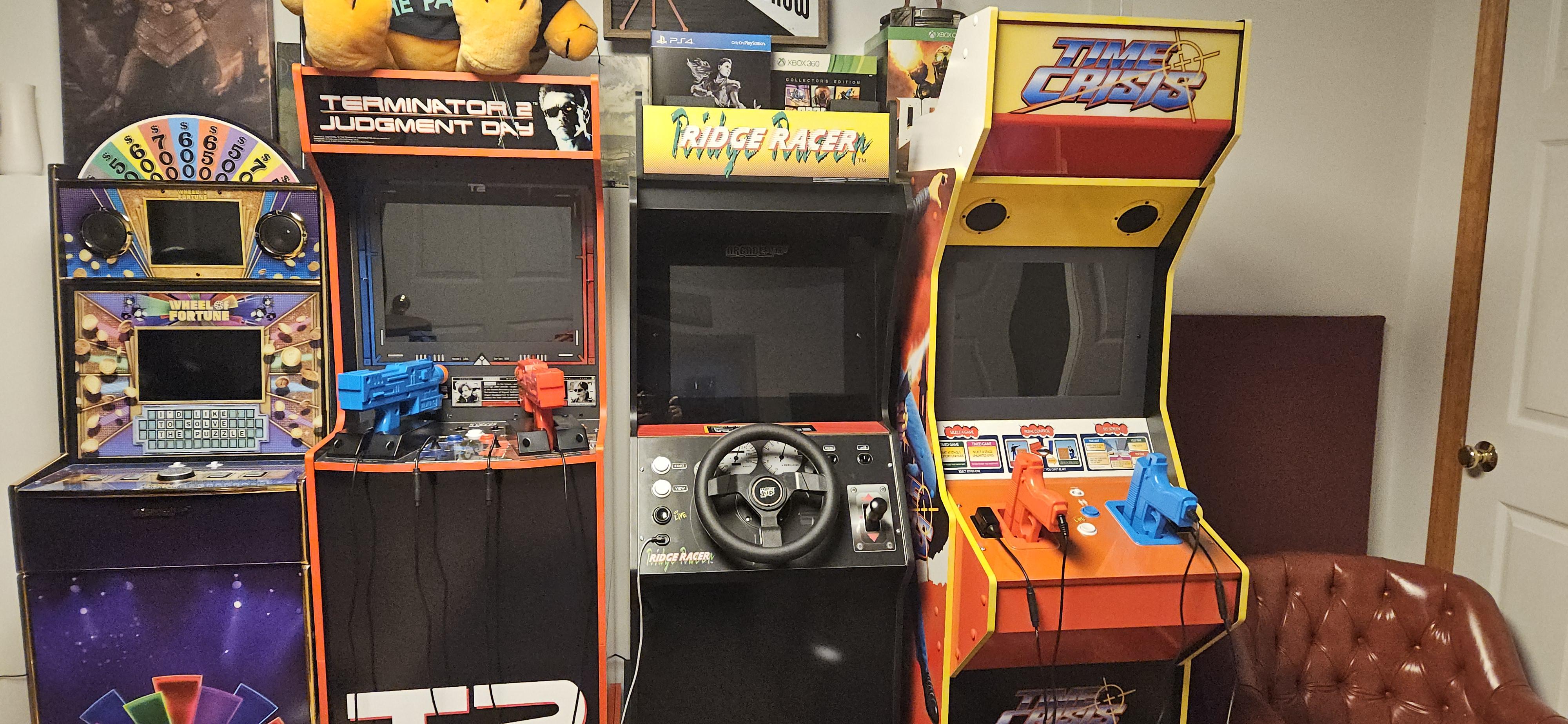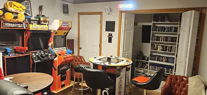 Just a few of the bunch of arcade cabinets in my brother's arcade rooms at this house, for those that kept asking me about it. That 4-player Pong table is what we were playing with friends and it's a blast!