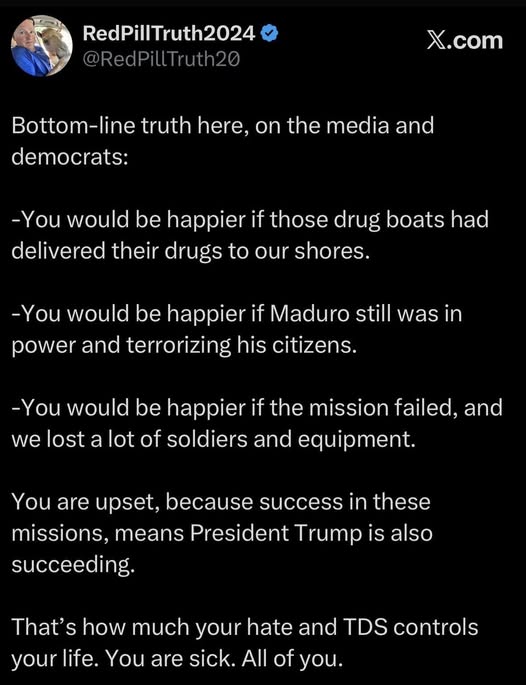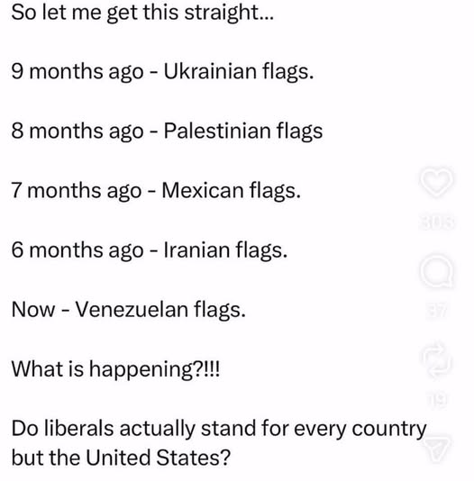 So i’ve been following this, and of the non-criminal Venezuelan’s that are here in the U.S. only the rabid radical left in California and other Left Leaning states are protesting for Maduro, all the actual Venezuelans are cheering for his arrest and having parties. Only the radical left democrats are calling for his release, so what does that tell you about the political opposition. To me it screams they’re too far gone..