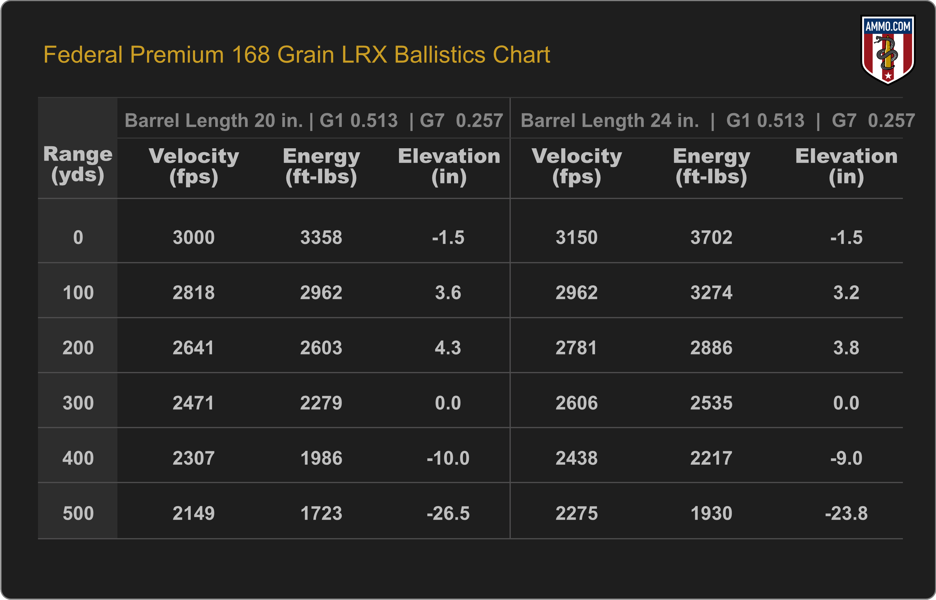 Federal Barnes LRX 168 Grain Ballistics Chart