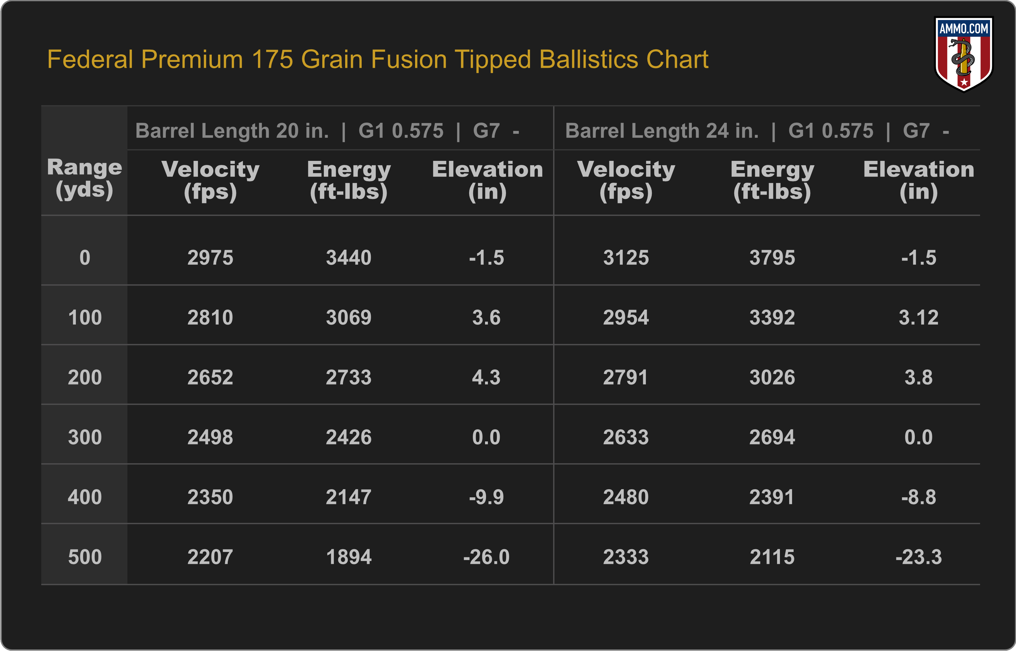 Federal Fusion Tipped 175 Grain Ballistics Chart
