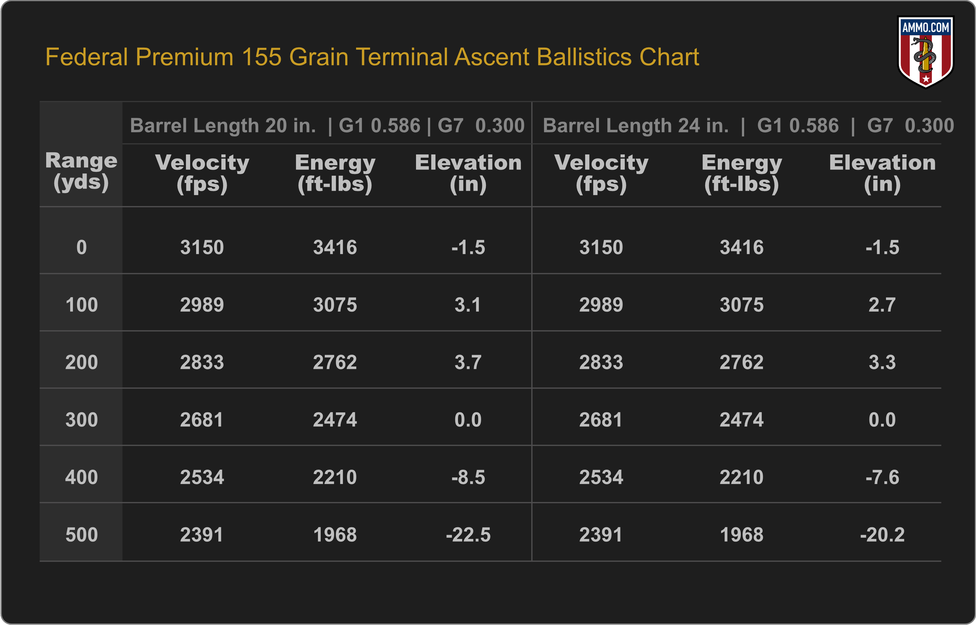 Federal Terminal Ascent 155 Grain Ballistics Chart