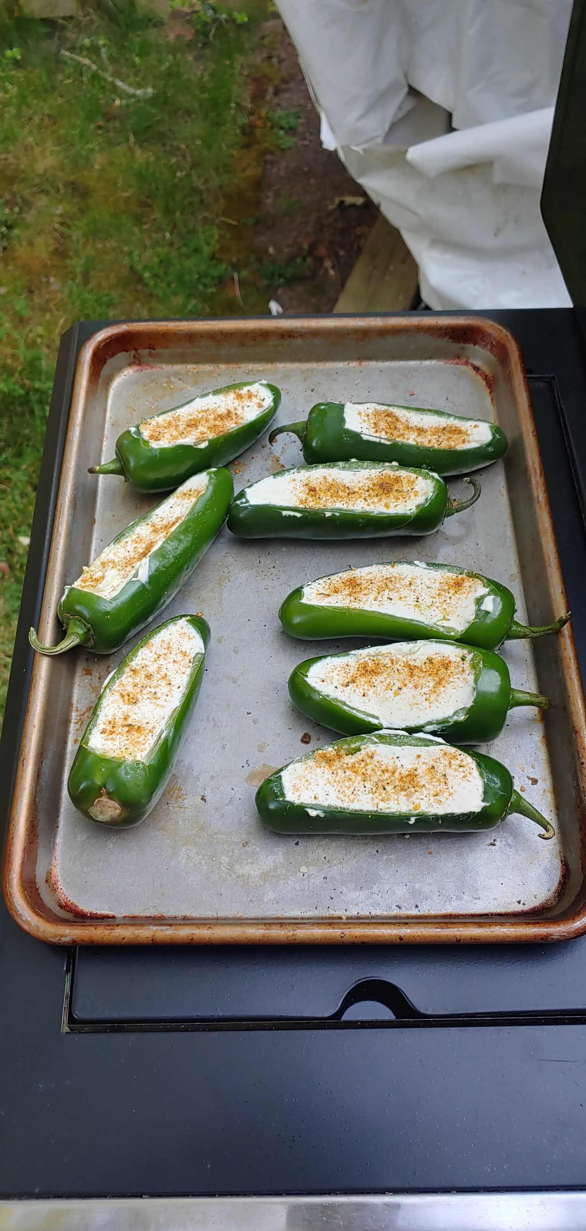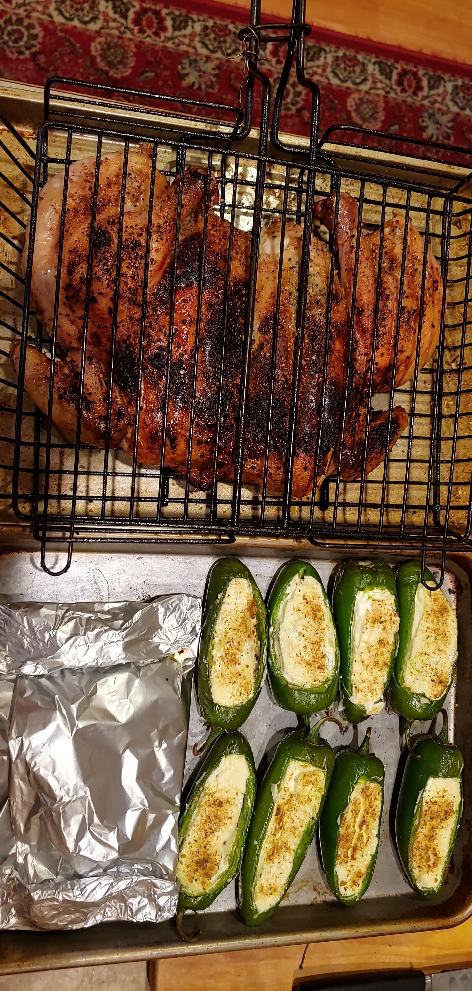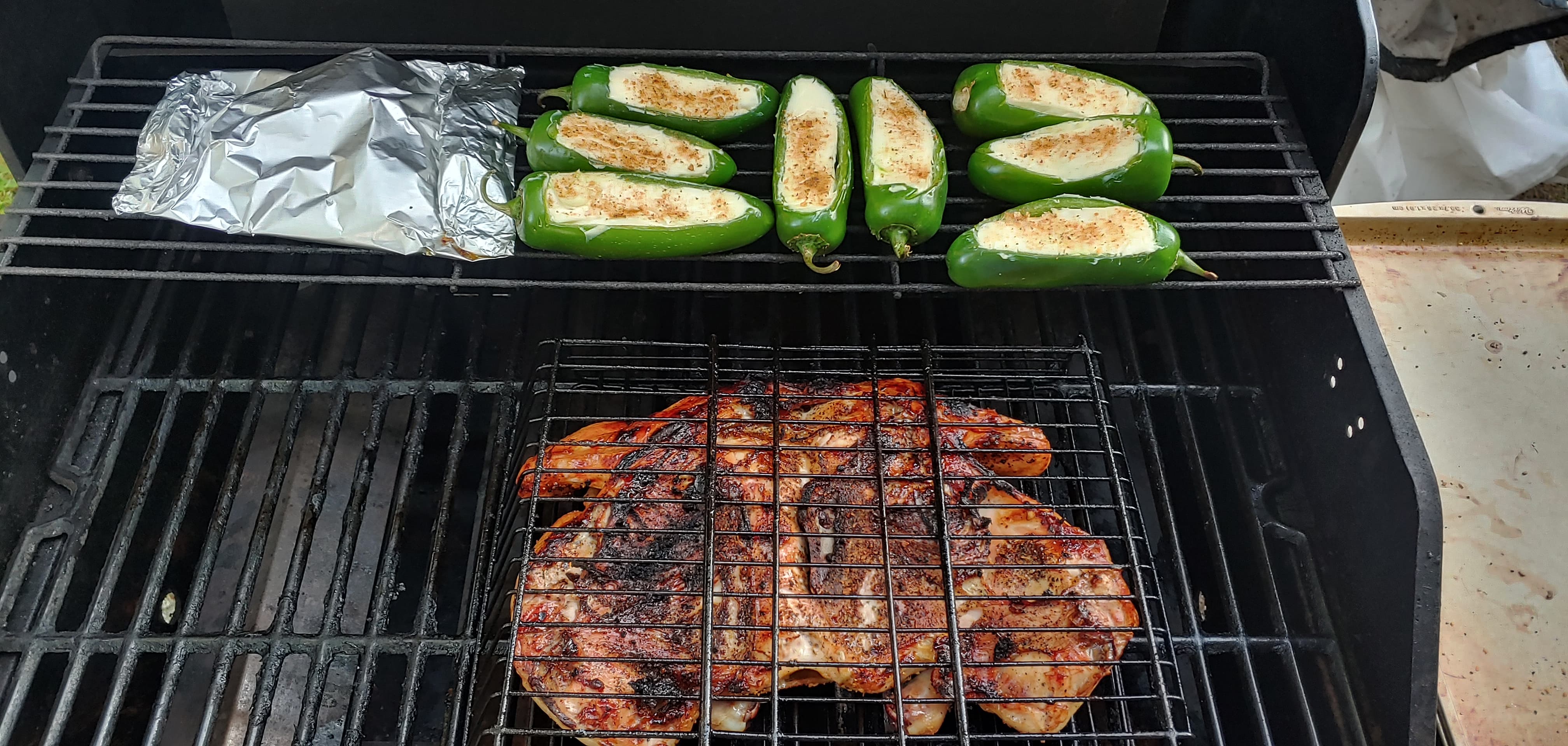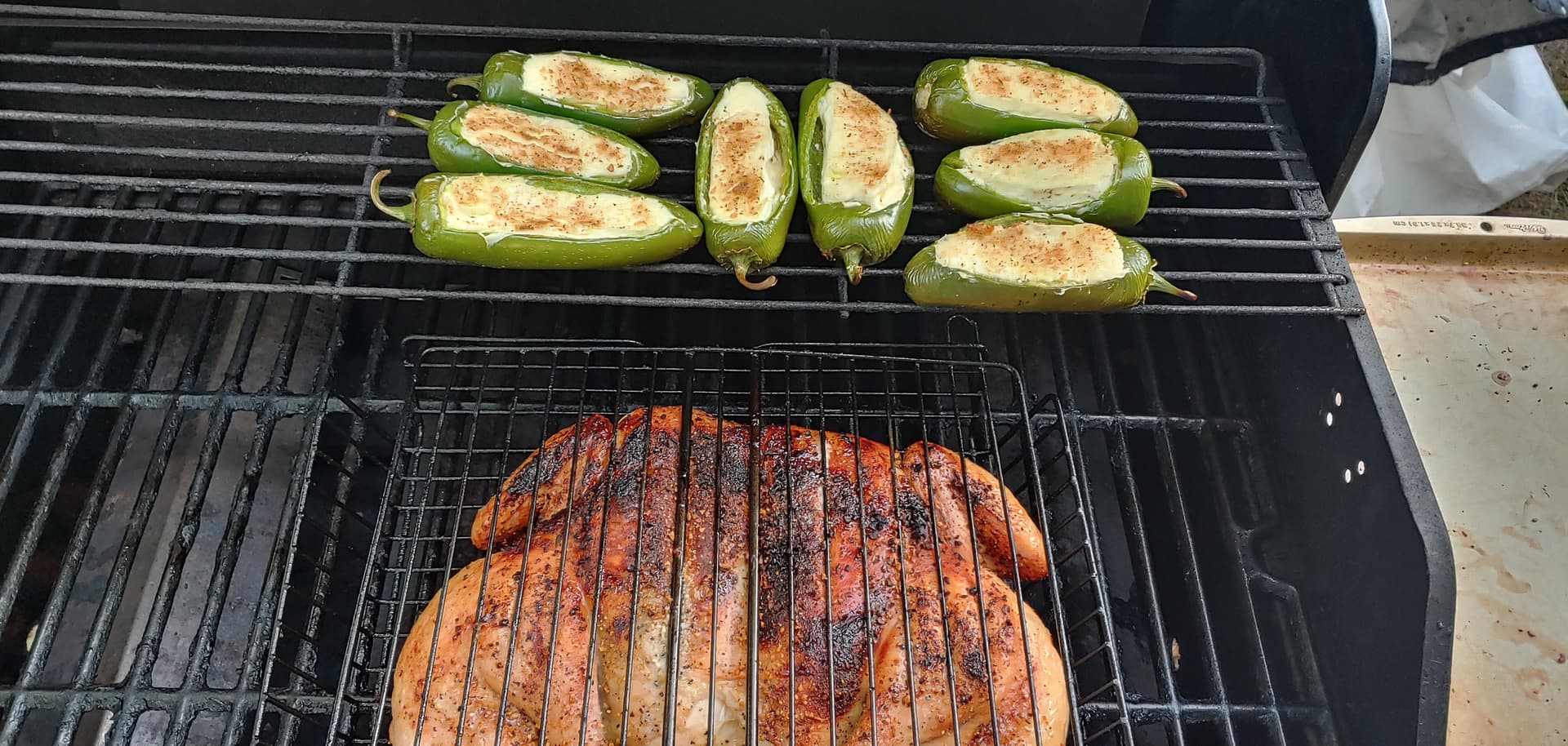 I put a butter herb mix under the skin at the breast and seasoned the other side of the chicken; poppers have sausage, smoked pepper white cheddar and cream cheese.