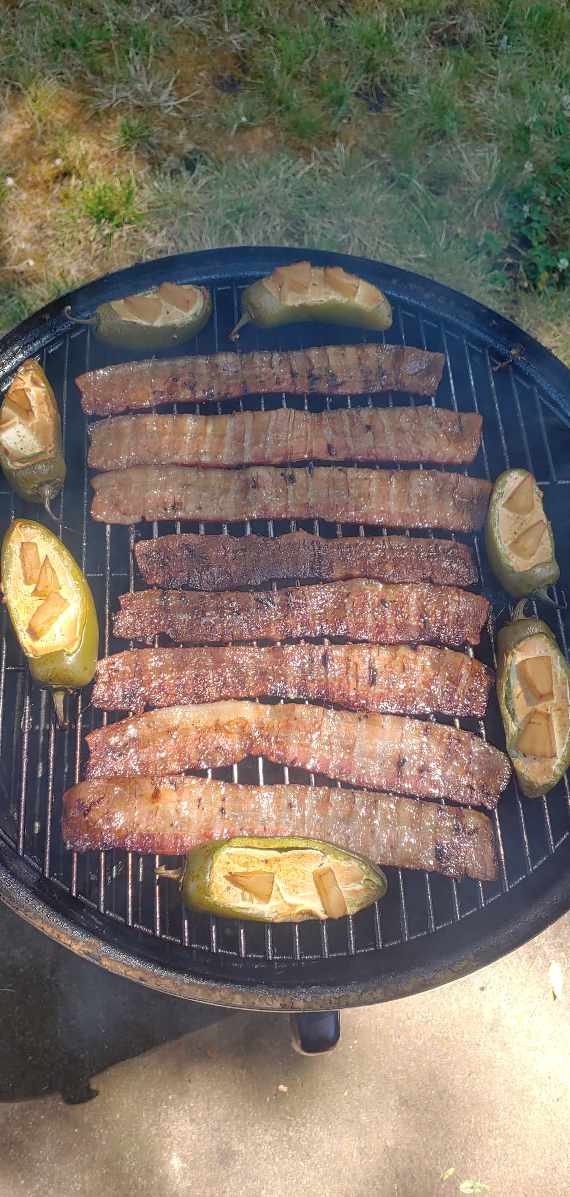 The pork bone in shoulder, in at 7: 30, in the oven 12:15 for 3 hours at 200. Bacon and poppers to finish things off.