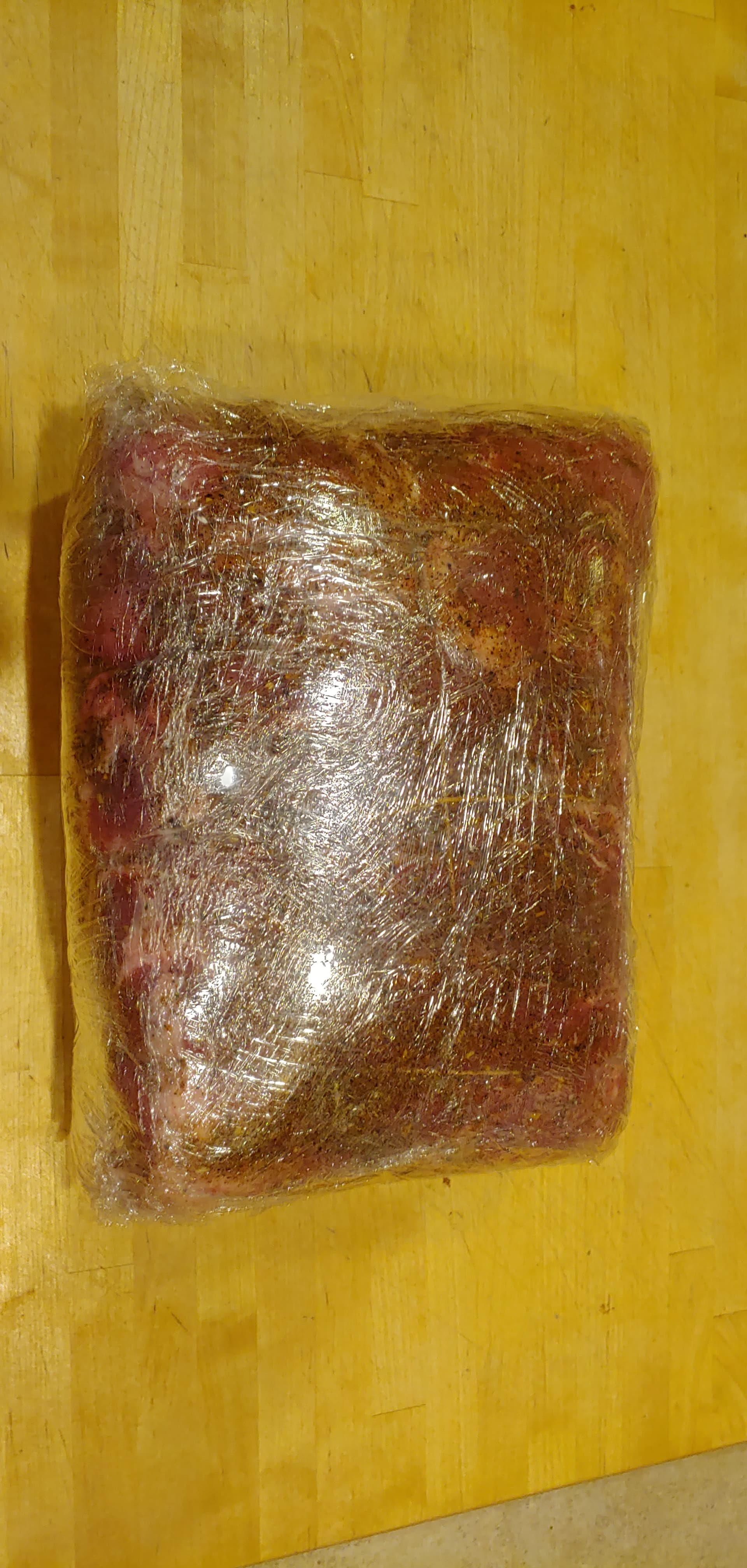 Got the brisket covered in rub and wrapped with plastic. Those are a pain to roll around and trim, even a little one.