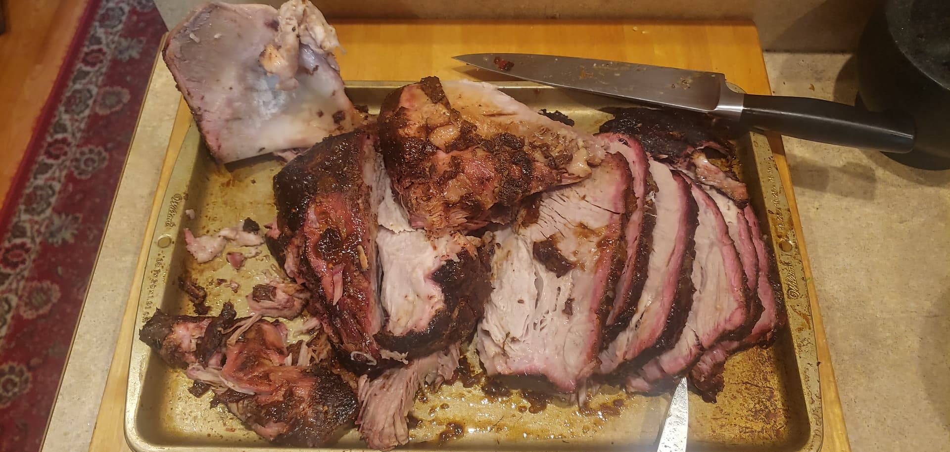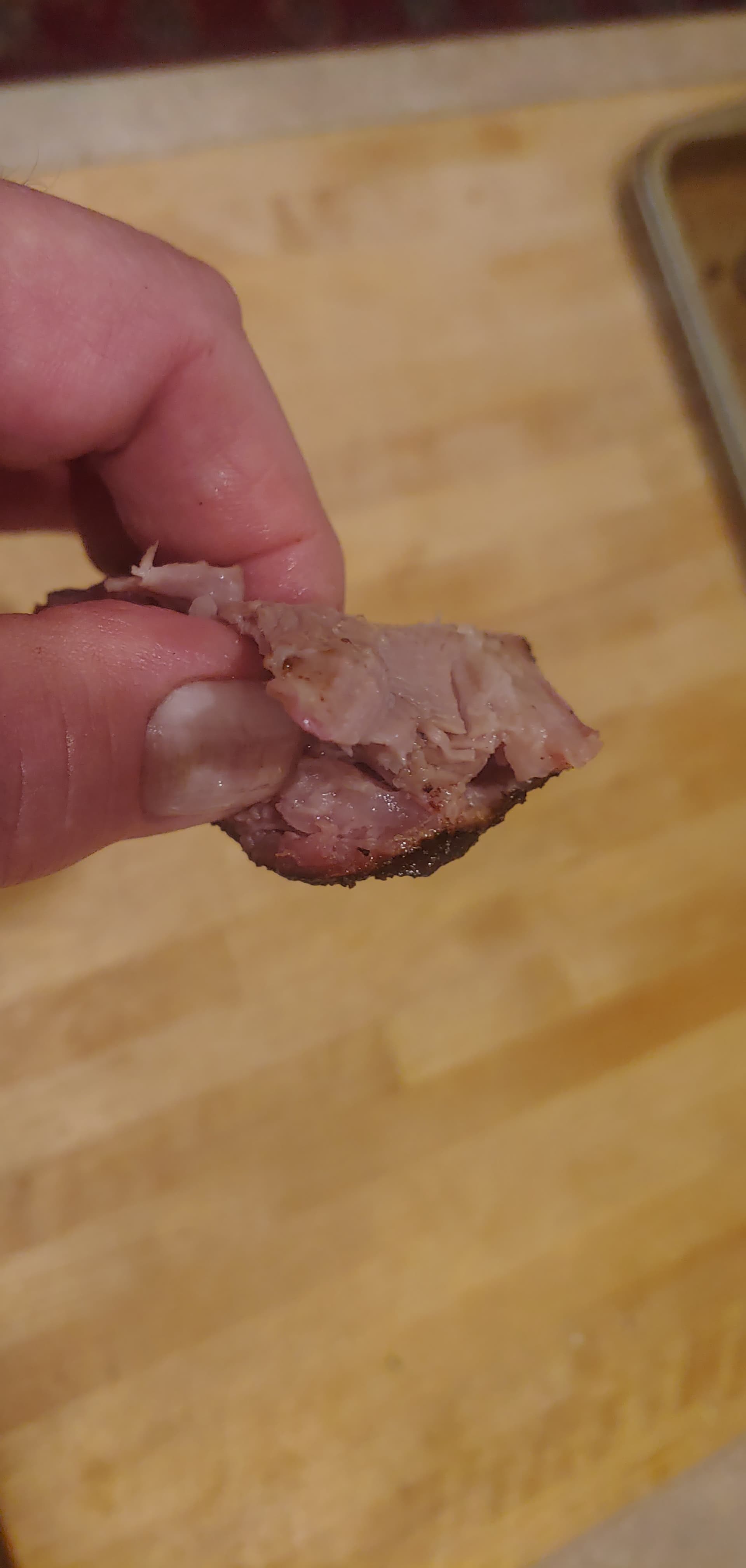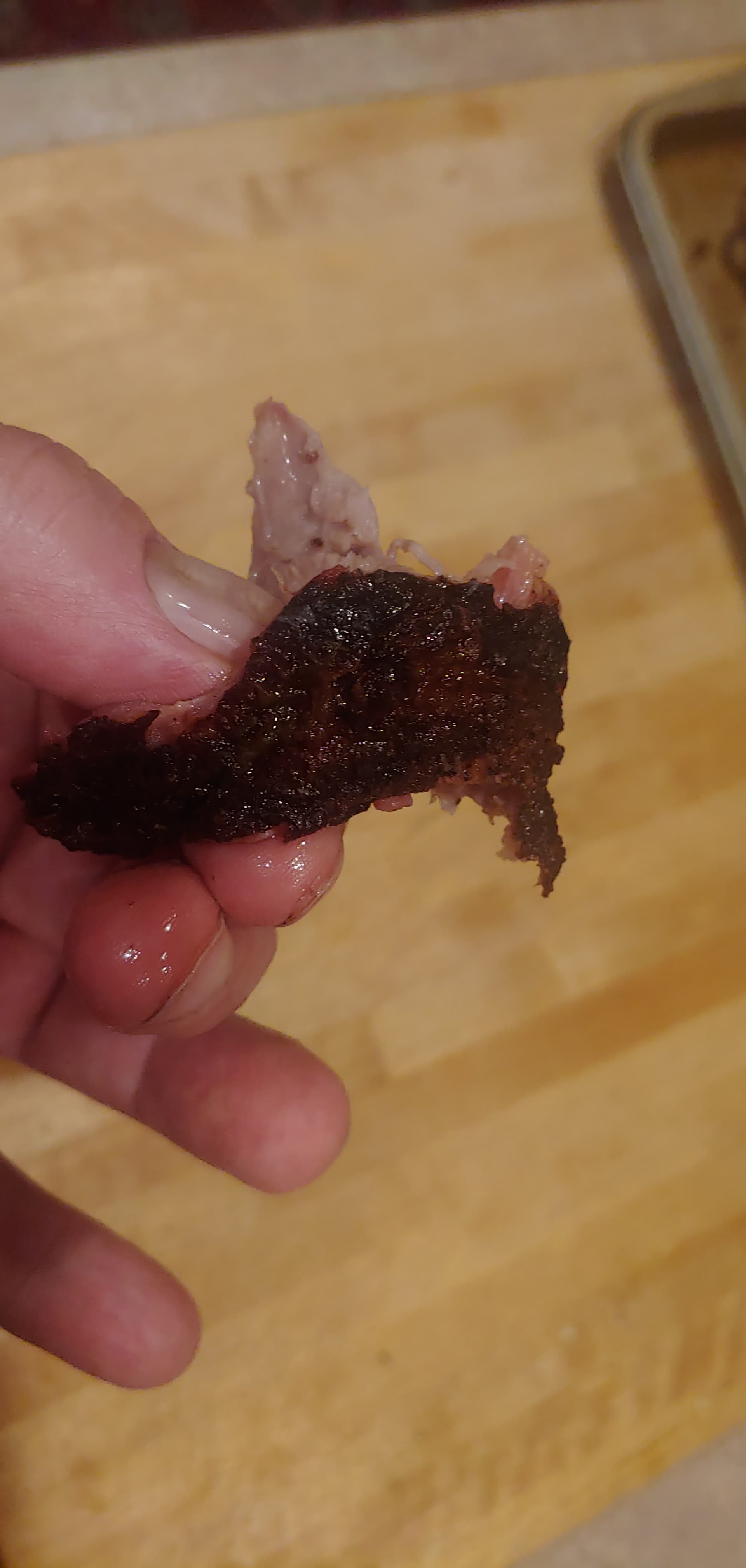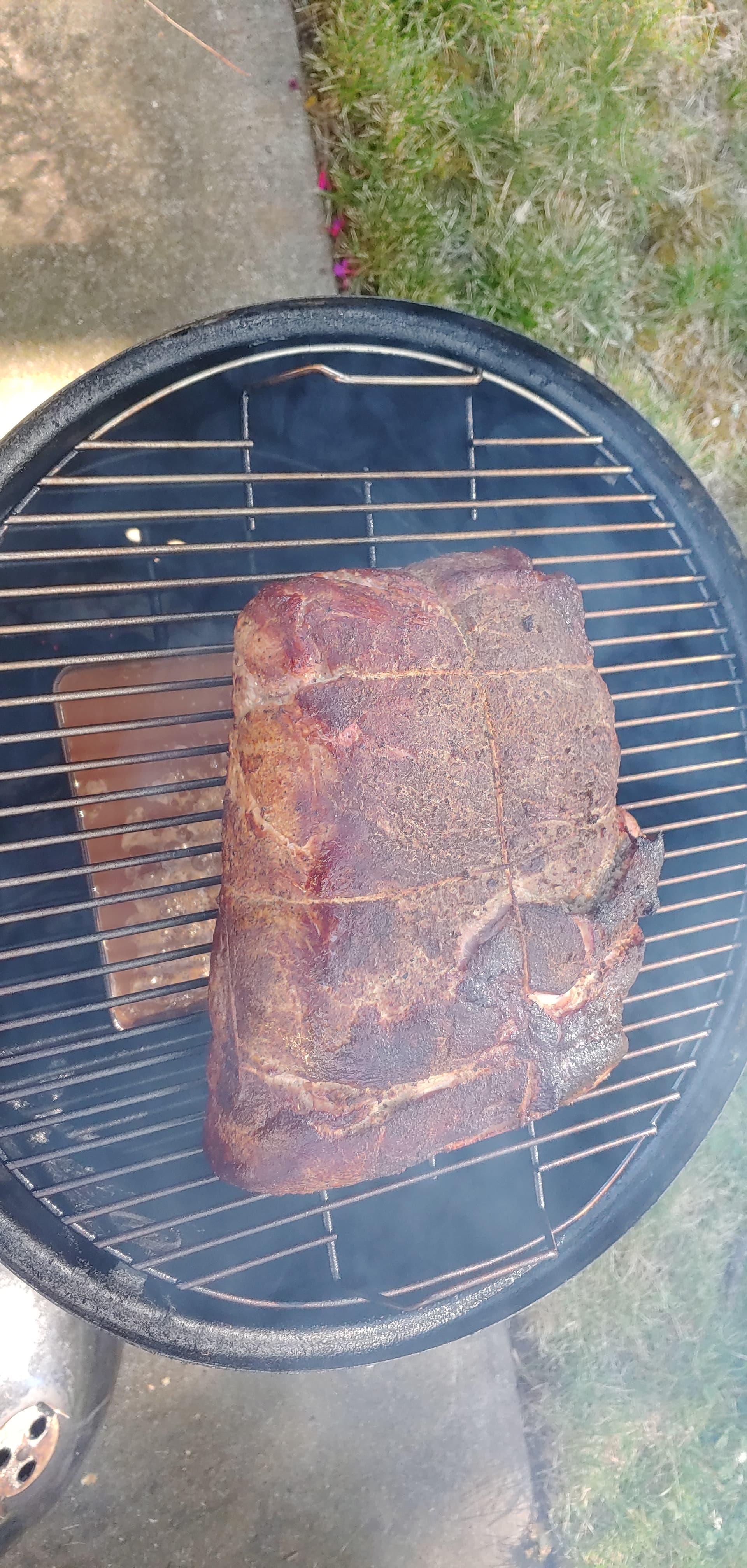 I couldn’t get pork butt last weekend so did 4 cushions. 2 up, 2 down. Over did the bark, used an apple cider marinade and brown sugar. Tastes good but a little stringy. Not as good as butt, they would have probably been better in the crock pot. $1.59/lb, dogs like it so not a total waste.