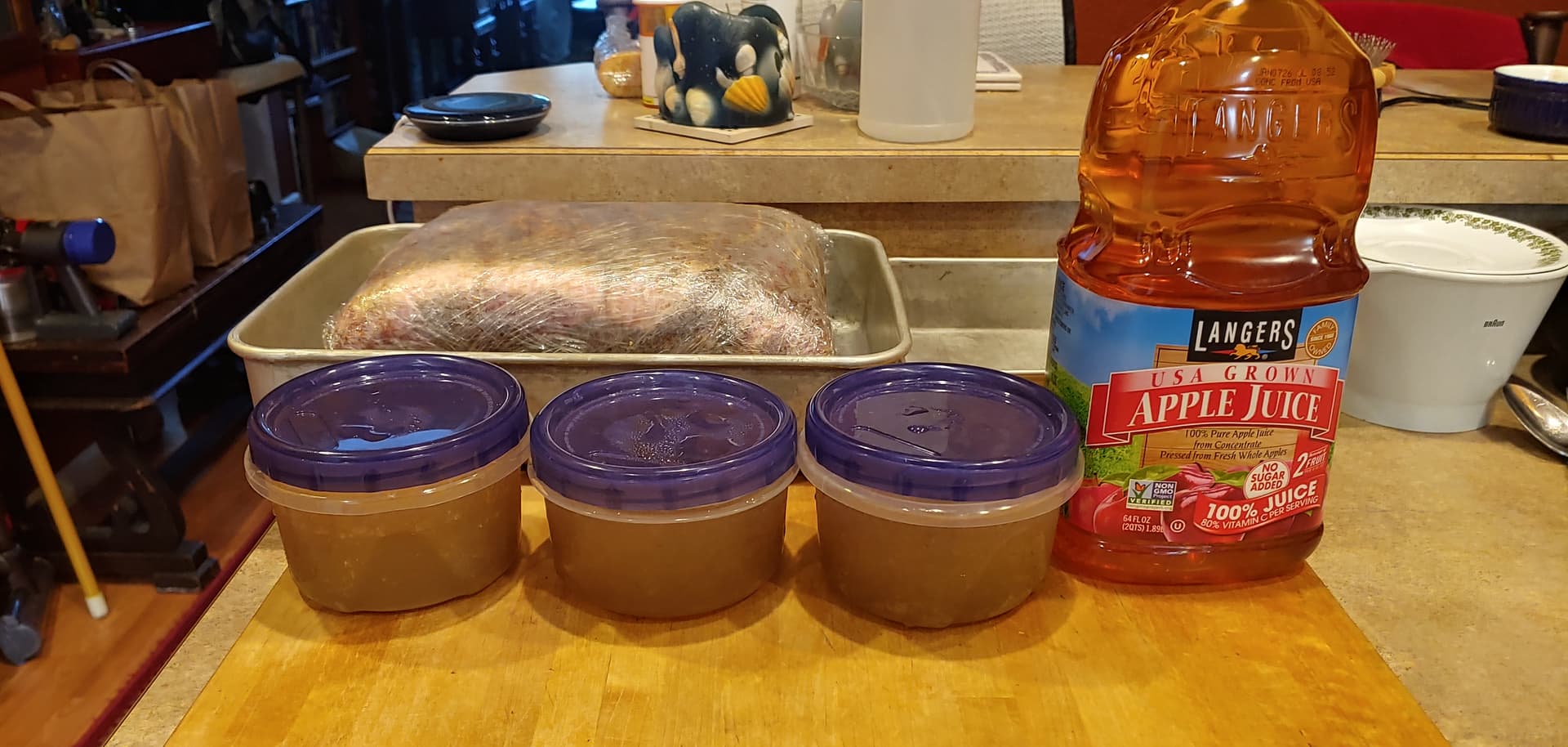 I mix some apple juice with homemade stock and smoke it as the liquid. Makes a great flavor for soups or rice or beans , gravy etc.