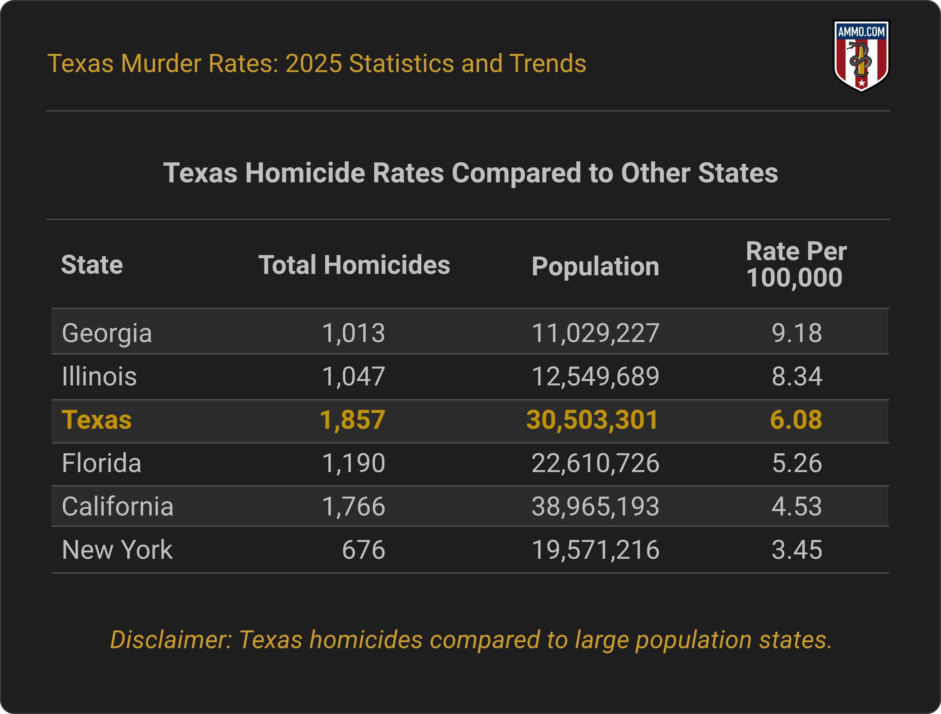California (4.53 per 100,000), Florida (5.26 per 100,000), and New York (3.45 per 100,000) had lower homicide rates than Texas in 2024. Georgia and Illinois had higher homicide rates at 9.18 and 8.34 per 100,000, respectively.