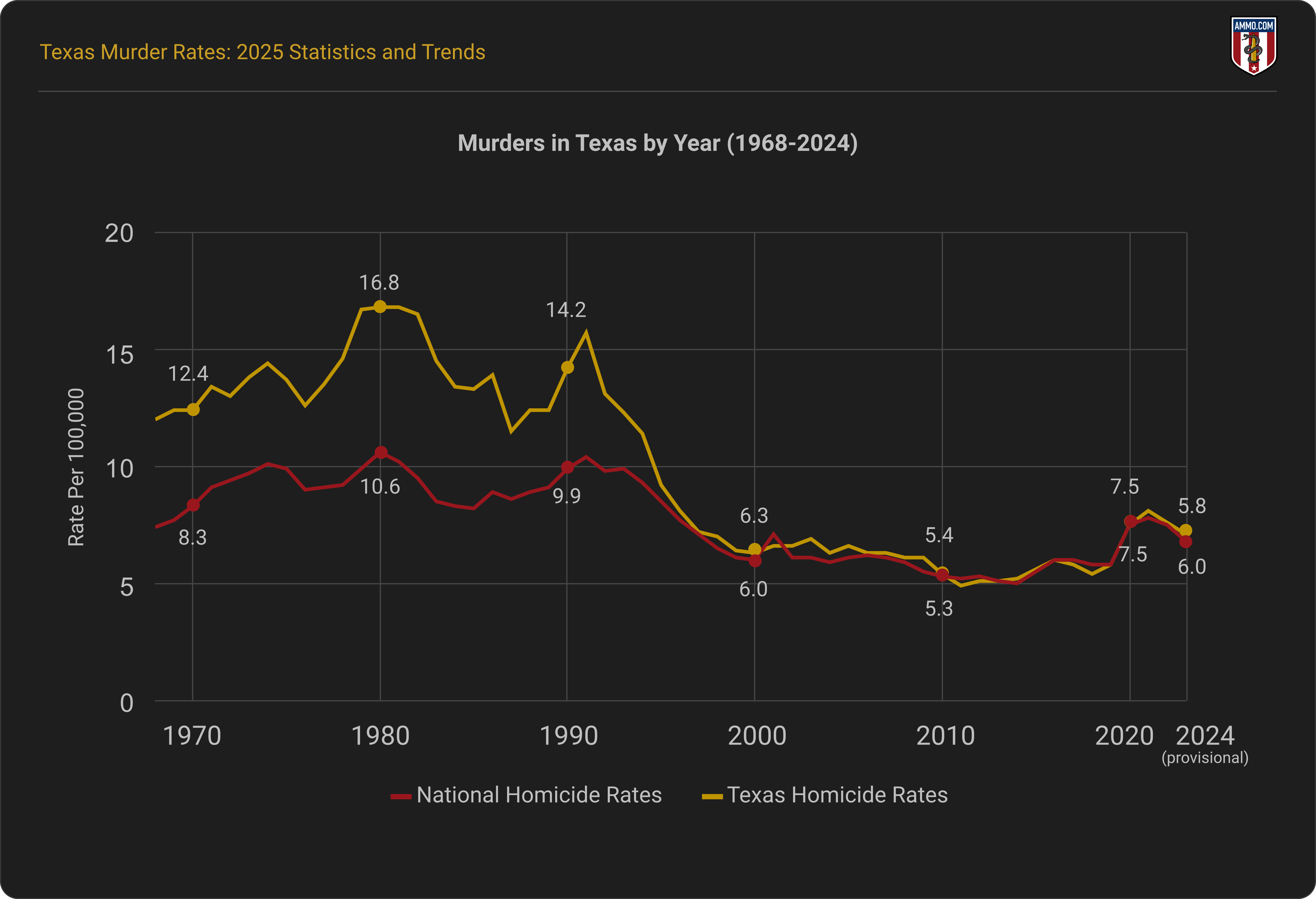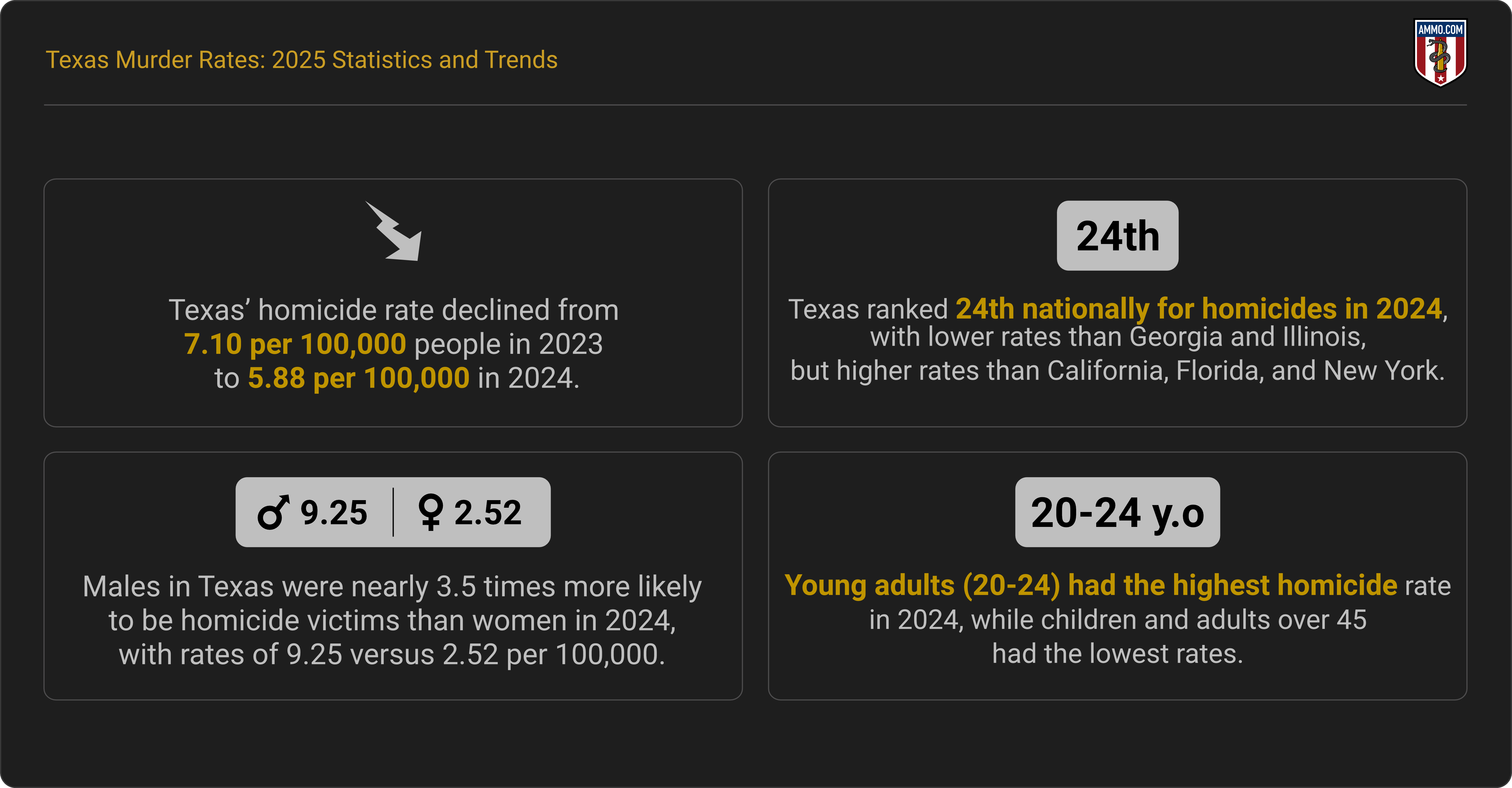Texas’ homicide rate in 2024 was 5.88 per 100,000; slightly below the national average of 6.00 per 100,000. 1, 2, 3