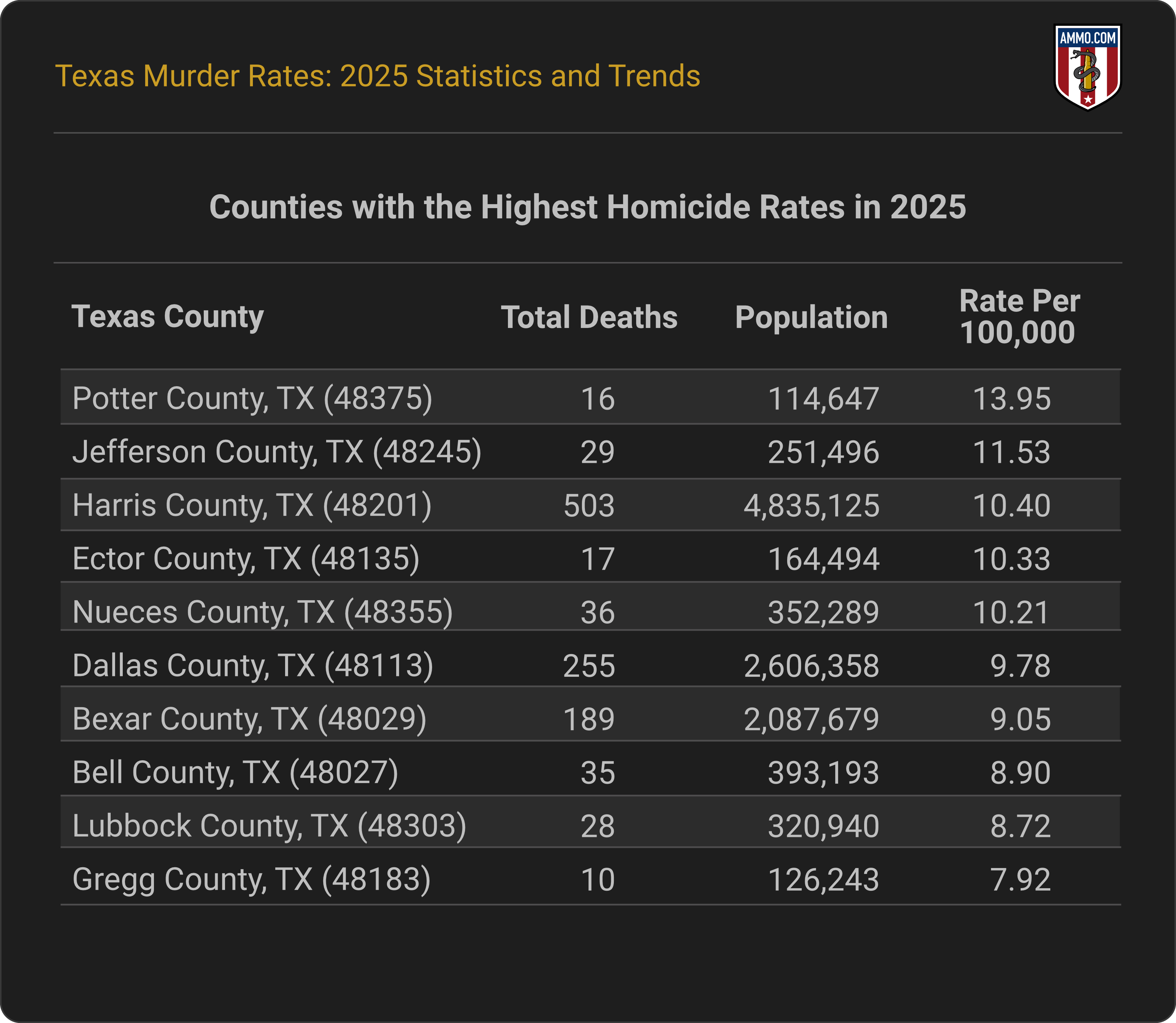 Potter County had the highest homicide rate in 2024 at 13.96 per 100,000 (16 murders), followed by Jefferson County at 11.50 per 100,000 (29 murders). Harris County had a rate of 10.40 per 100,000 (503 murders); Ector County, 10.3 per 100,000 (17 murders); Nueces County, 10.22 per 100,000 (36 murders).