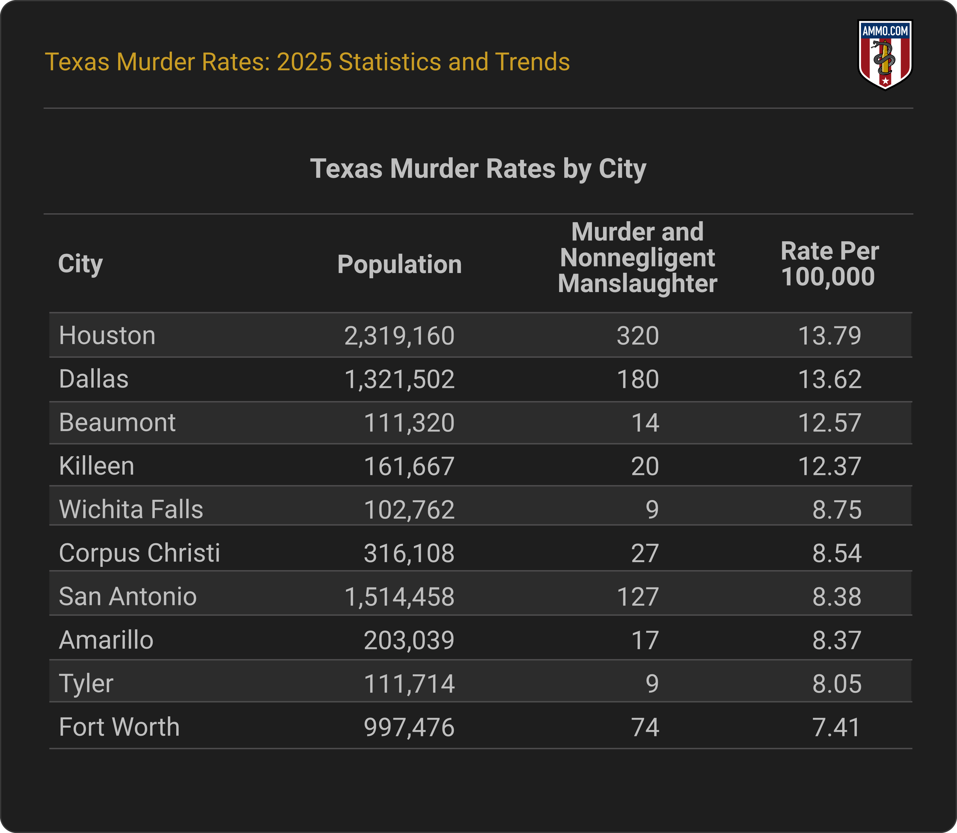 Houston had the highest homicide rate of any city in Texas in 2024 at 13.80 per 100,000 (320 murders), followed by Dallas, Beaumont, Killeen, and Wichita Falls. 3