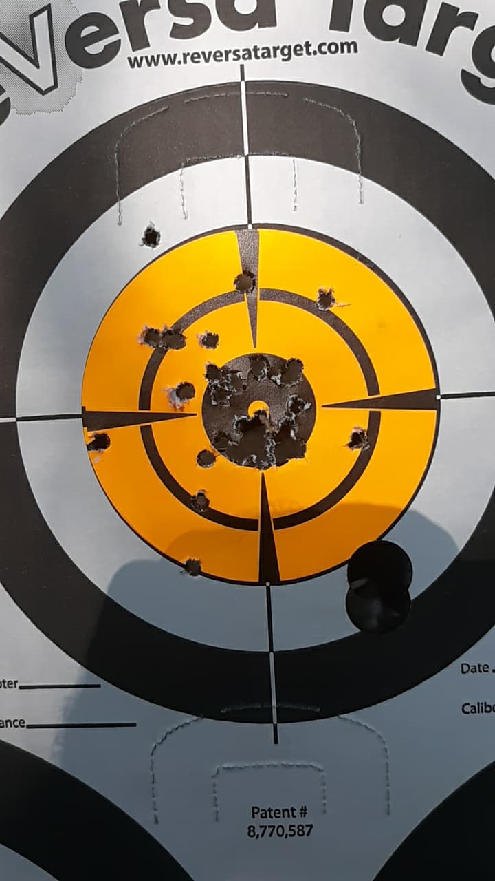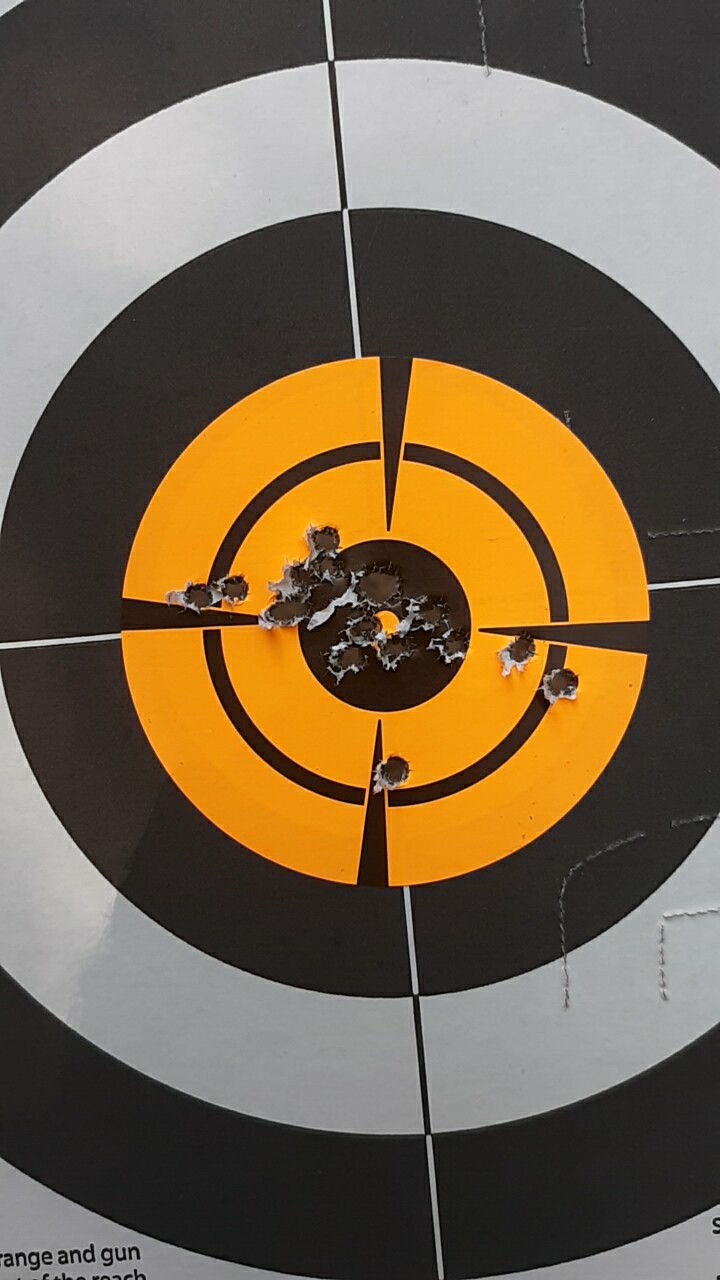 I went all gangsta, last target i was sighting in and when it started hitting center i quit. first one is me tryin to be John dillinger and fast shooting. left to right holes is probably me jerkin the trigger. i may have to put an FRT in this thing.