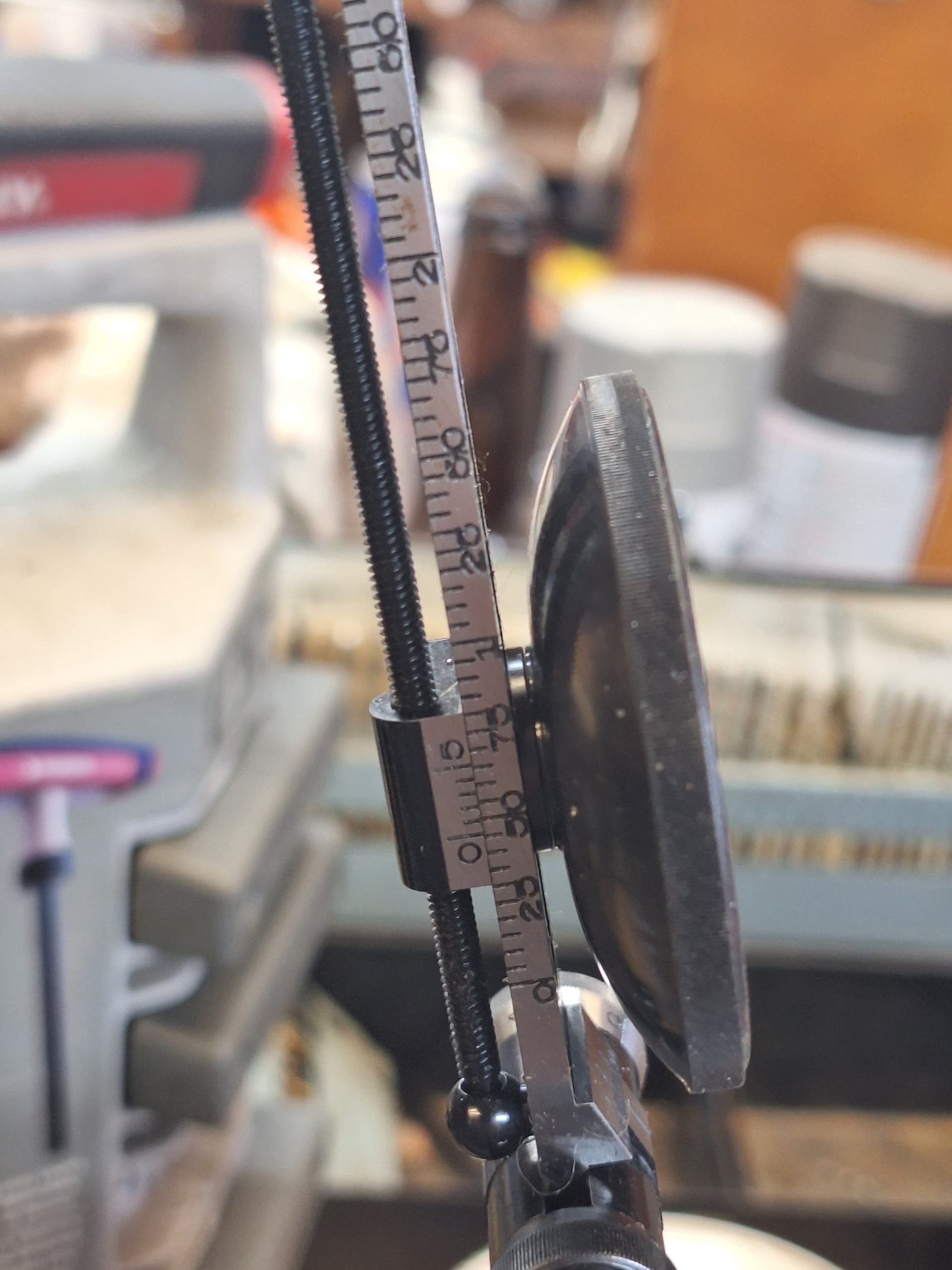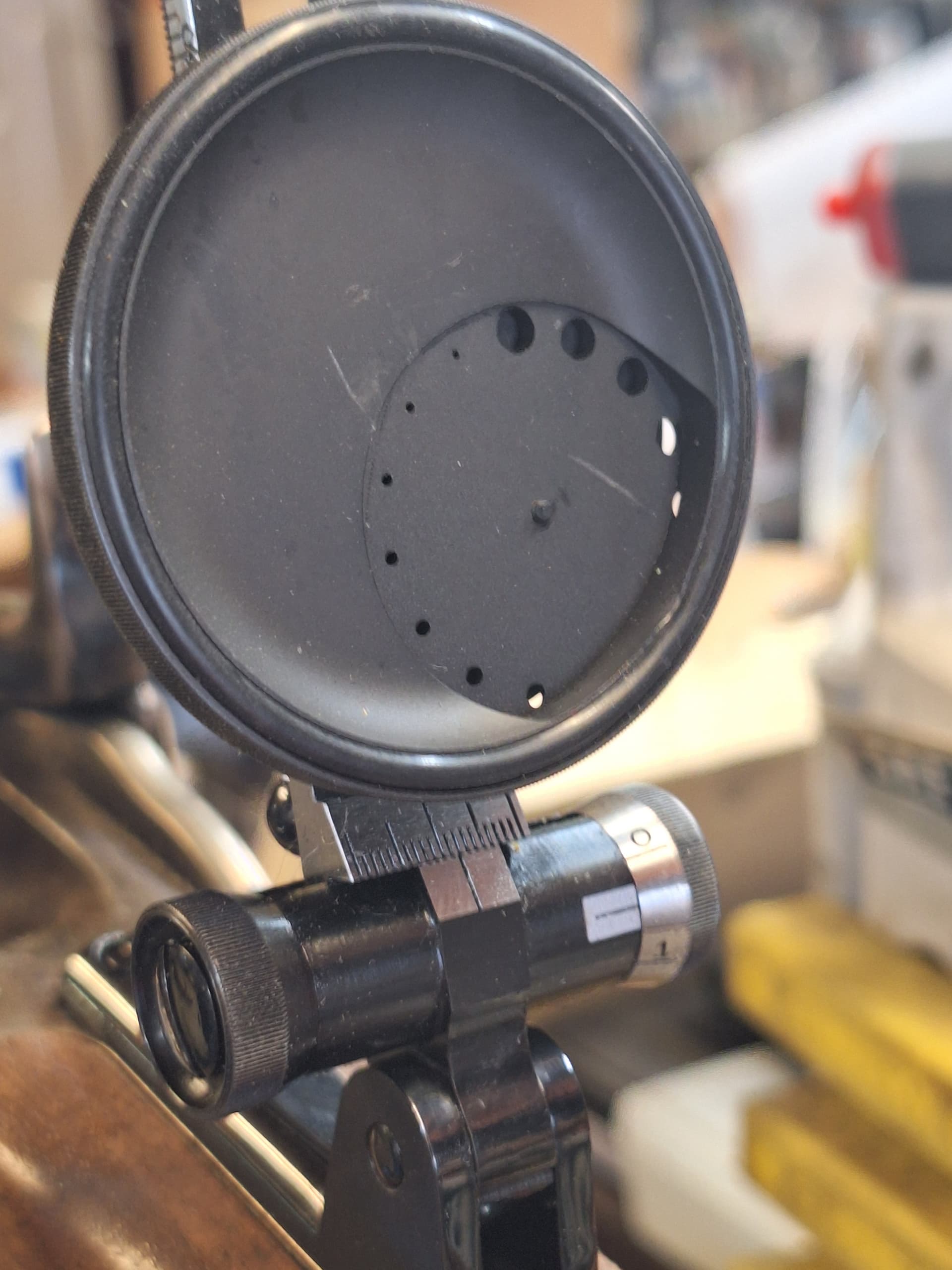 So Observation 1: Sight radius 36-1/4”. I’m calling that 1 yard. Vernier rear sight is calibrated at 100 to the inch, 20 lines @ 0.5” to the inch. That makes it pretty easy, 1/100th of an inch @ 1 yard =1” @ 100 yards. 2” @ 200yards.