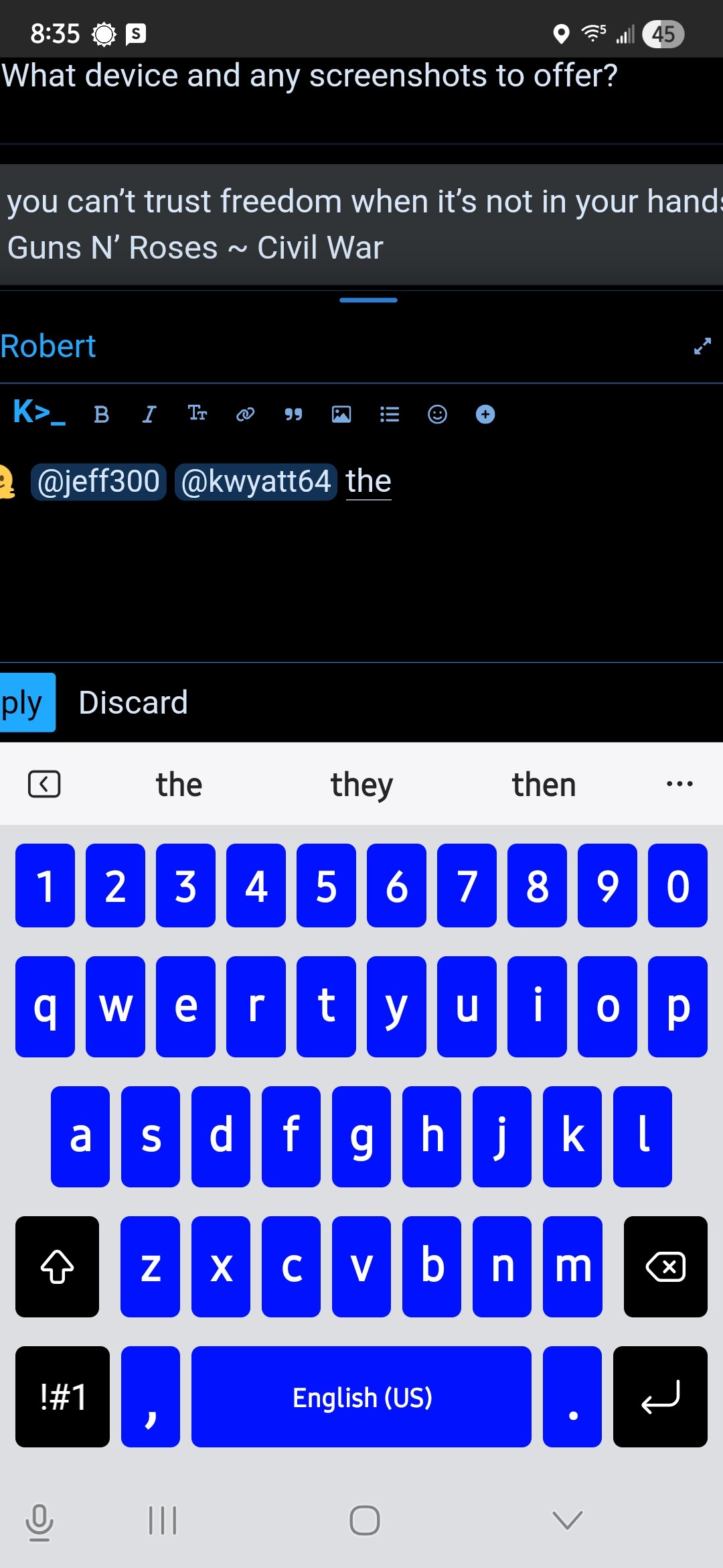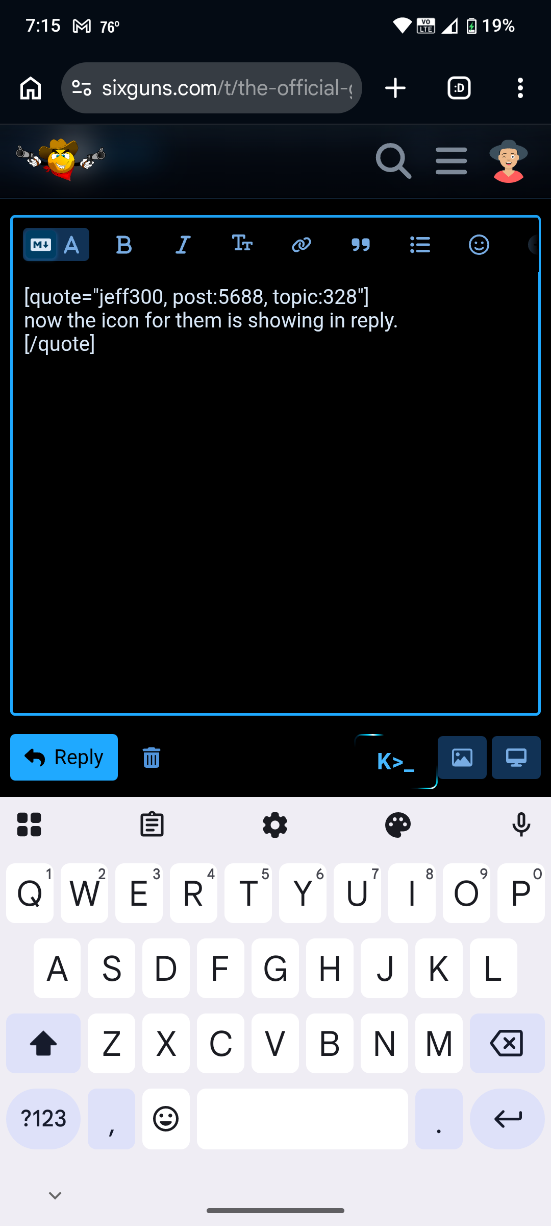The screenshot shows a phone browser on sixguns with the reply editor open, quote tags in the text box, and the smiley/emoji button visible on the toolbar. Yeah, that’s basically a redundancy in the UI.