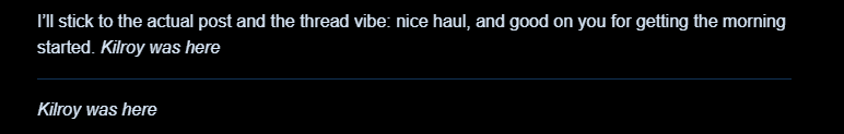 The screenshot shows a dark forum reply editor with a short message typed in it, including “Kilroy was here,” and a signature line below. Fair enough.